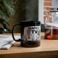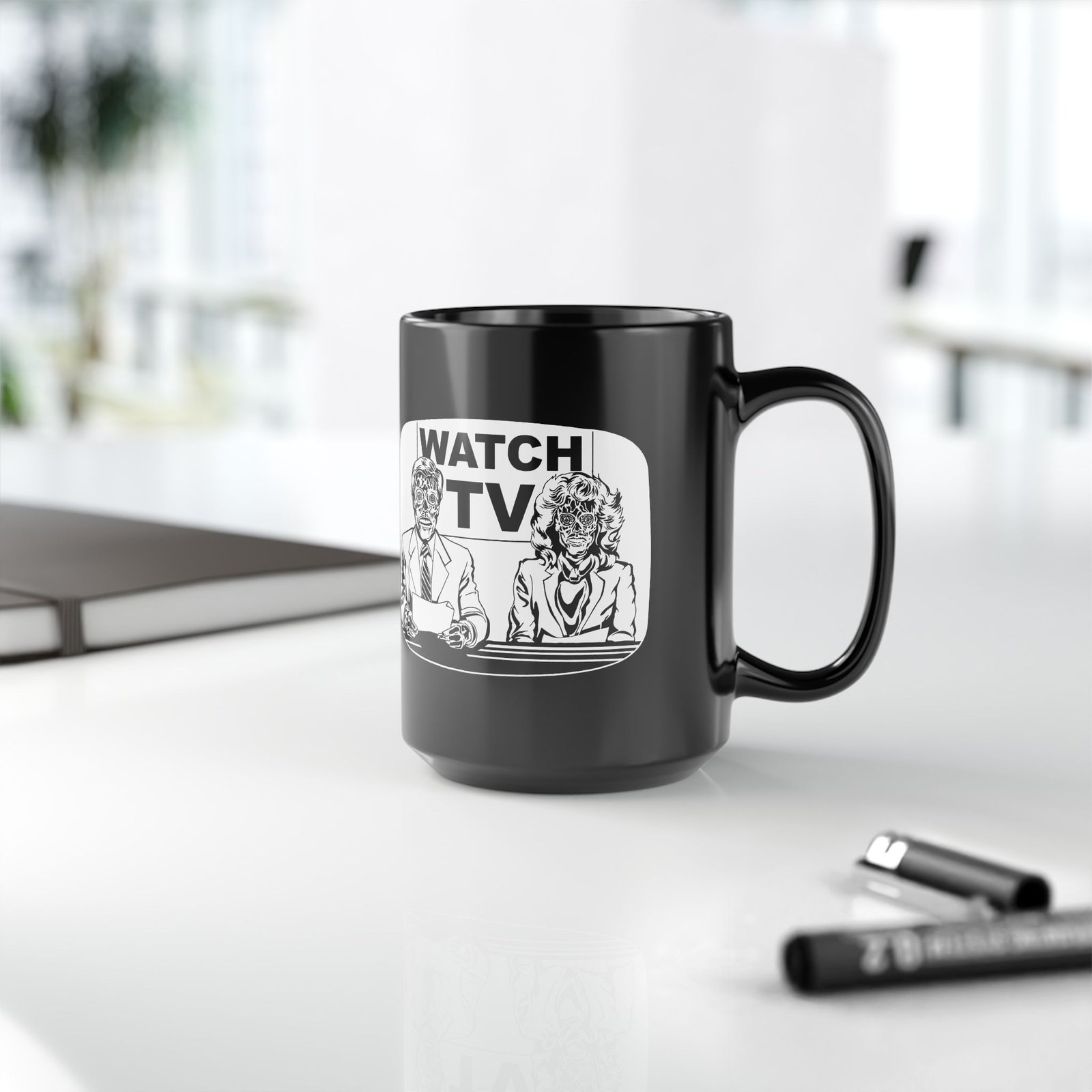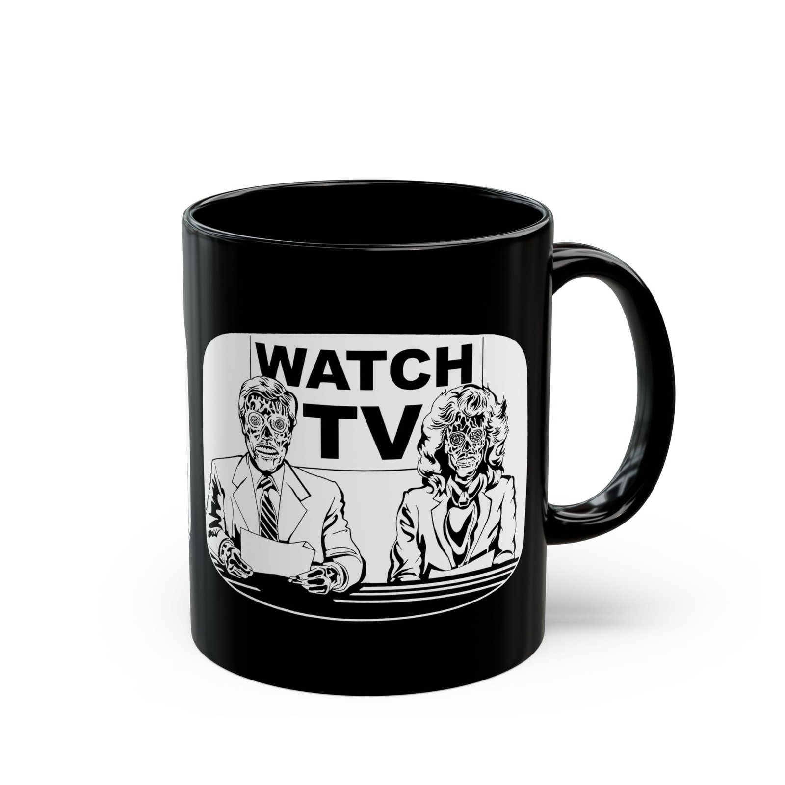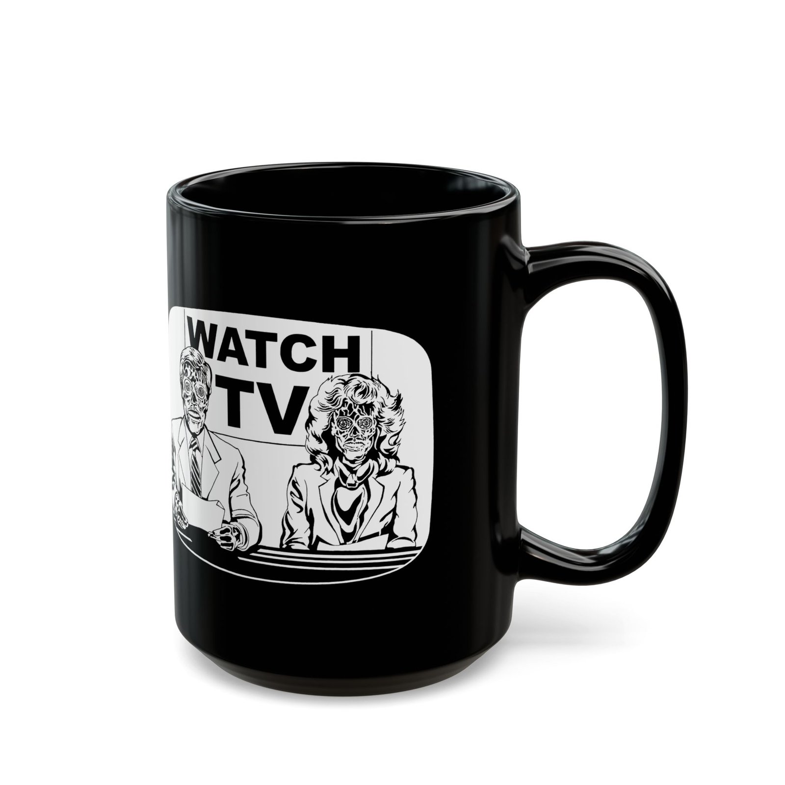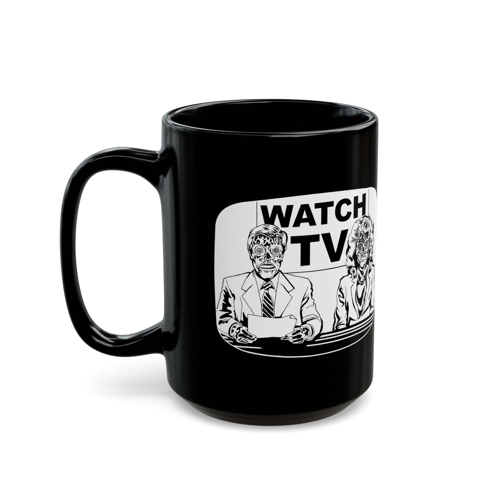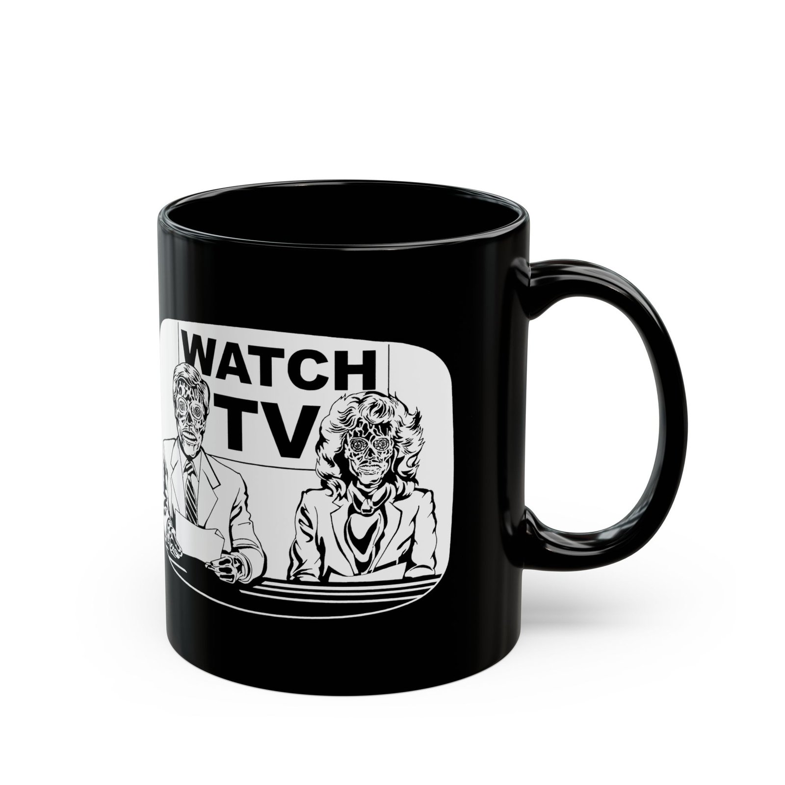Start your morning with a side of subversion using this bold Watch TV black ceramic mug, inspired by the cult classic They Live. Featuring eerie alien-faced news anchors and the haunting message “Watch TV” behind them, this 11 or 15 oz mug is perfect for fans of retro sci-fi, dystopian vibes, and media control commentary.