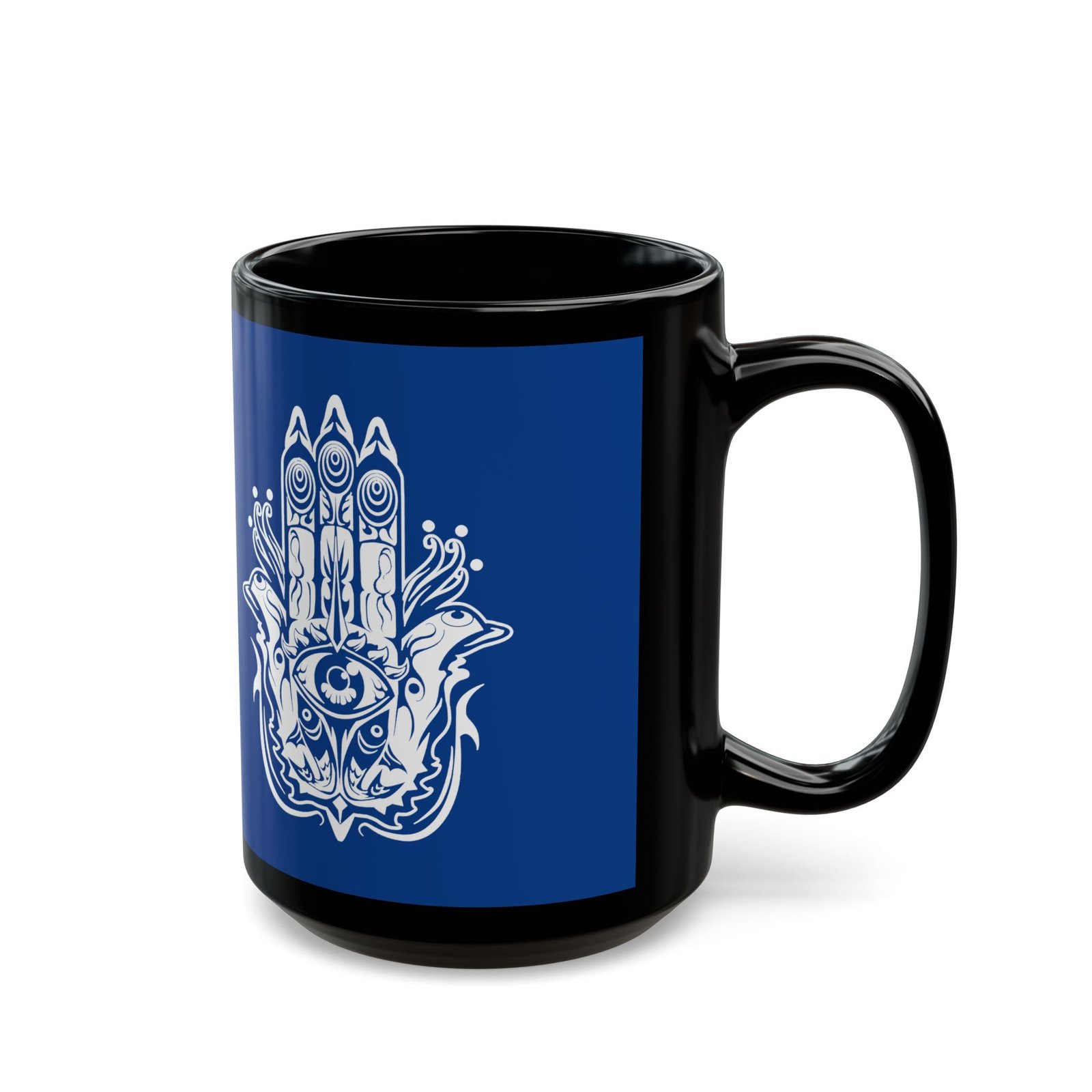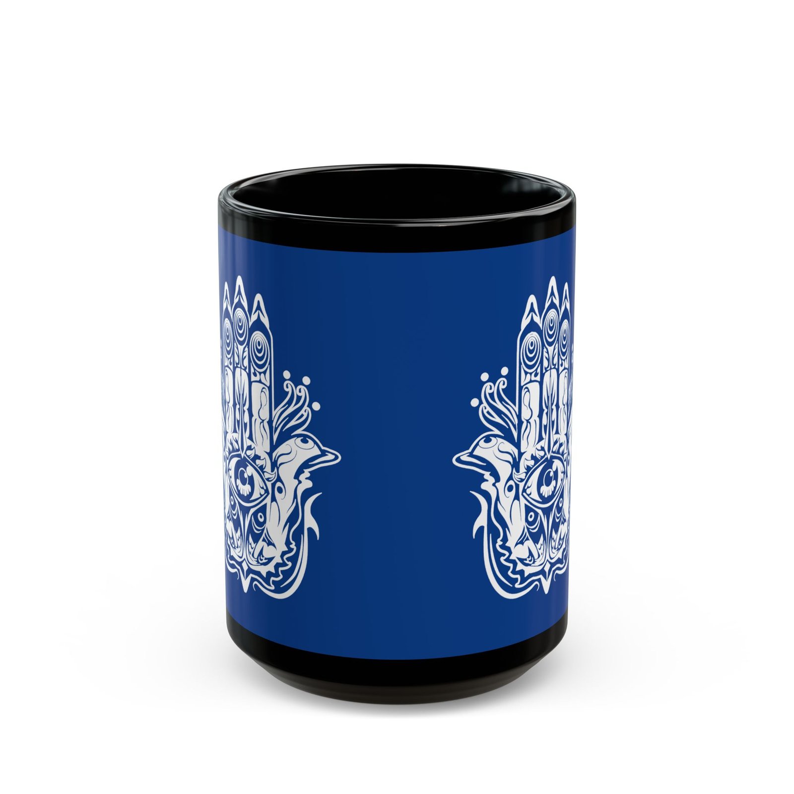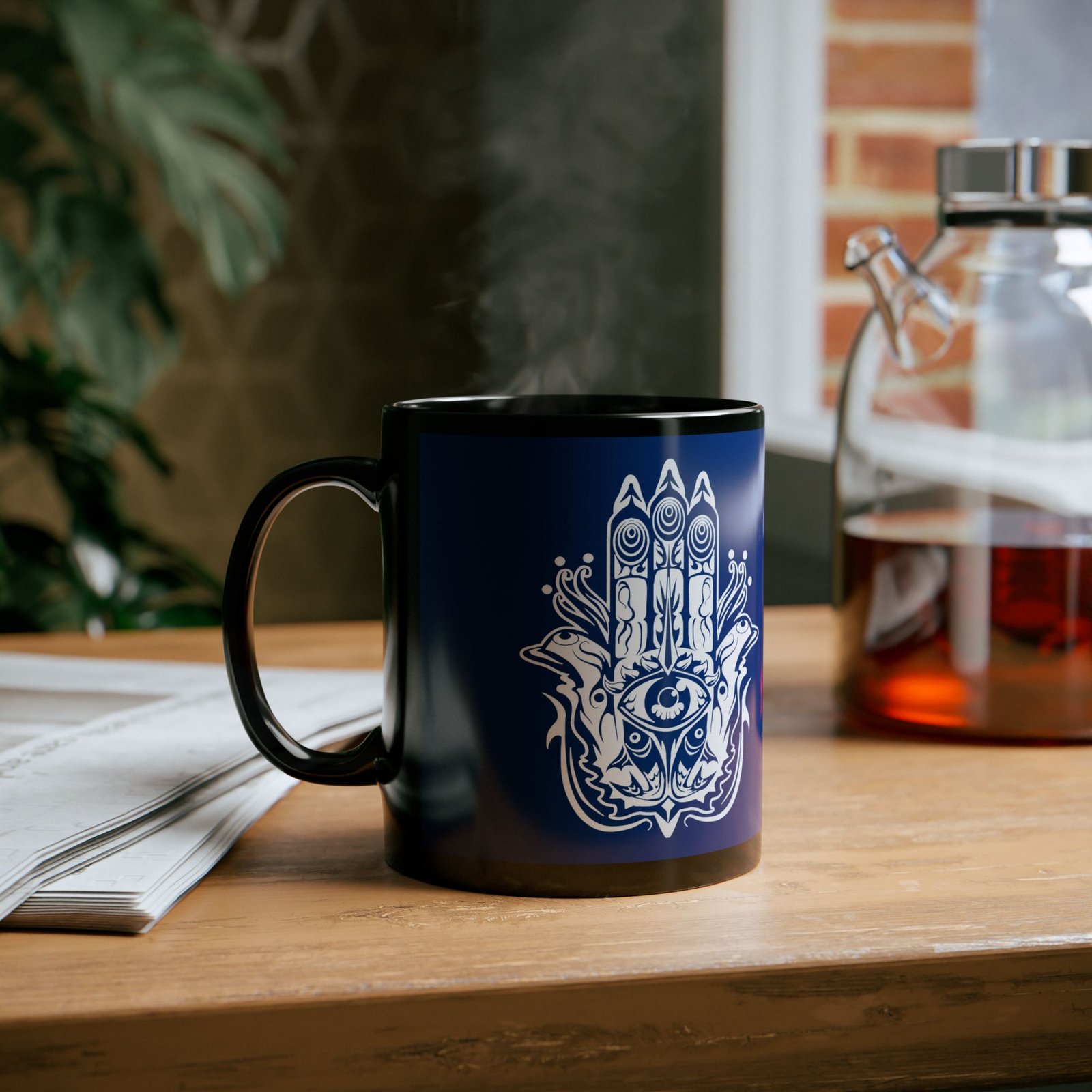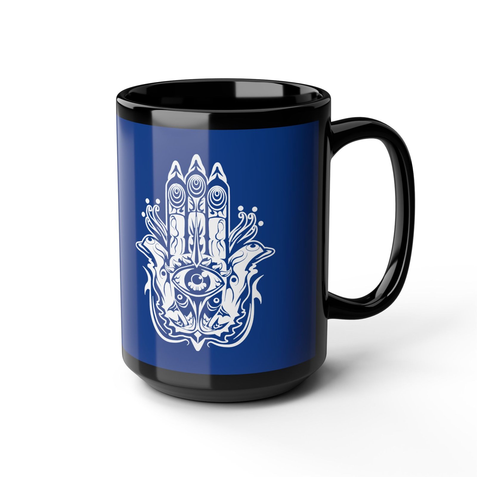 Bring balance to your daily routine with this elegant Hamsa black ceramic mug. Featuring a beautifully detailed hand of Fatima design, this 11 or 15 oz mug is more than just drinkware.