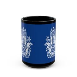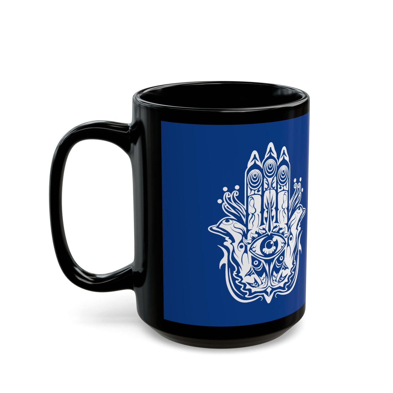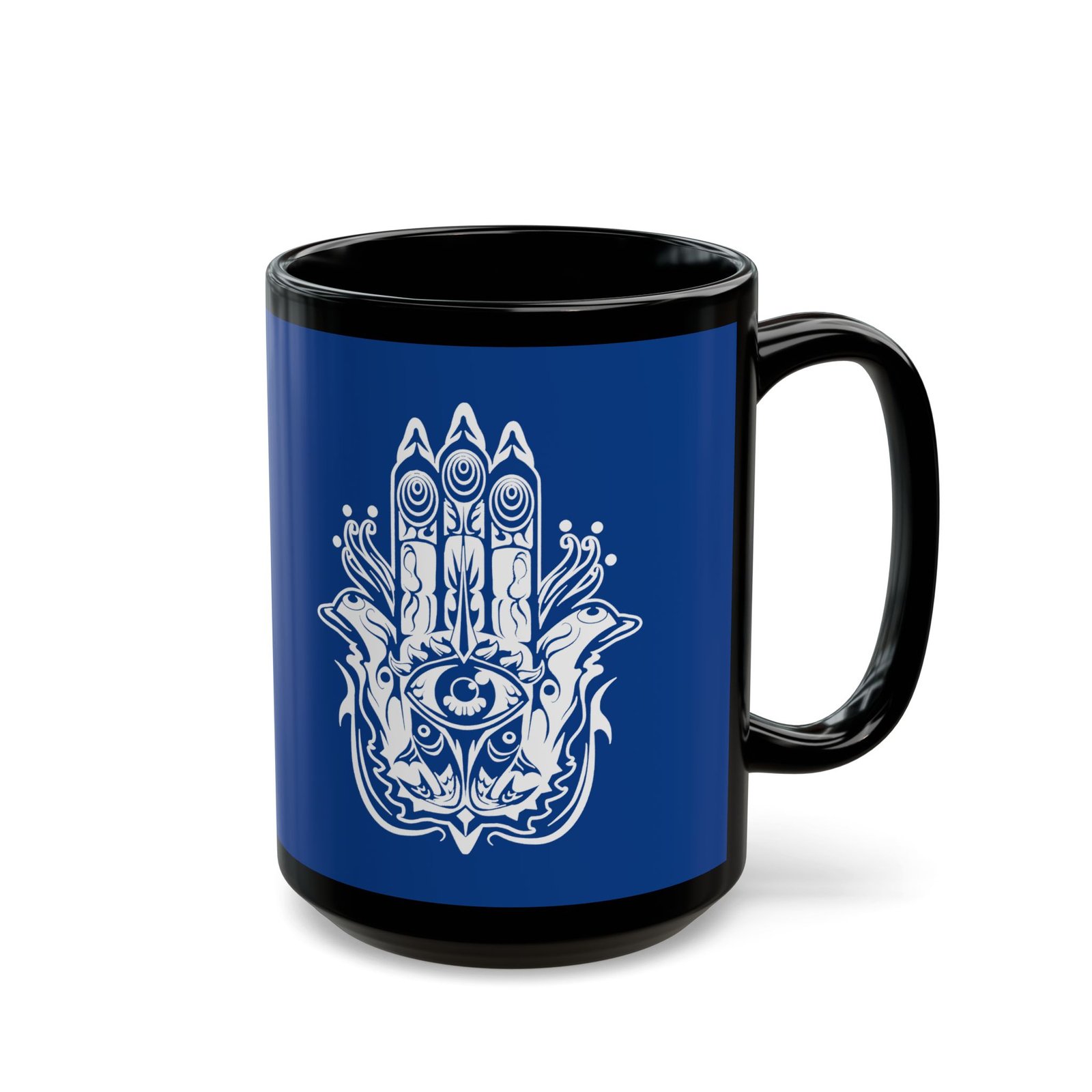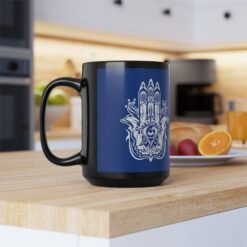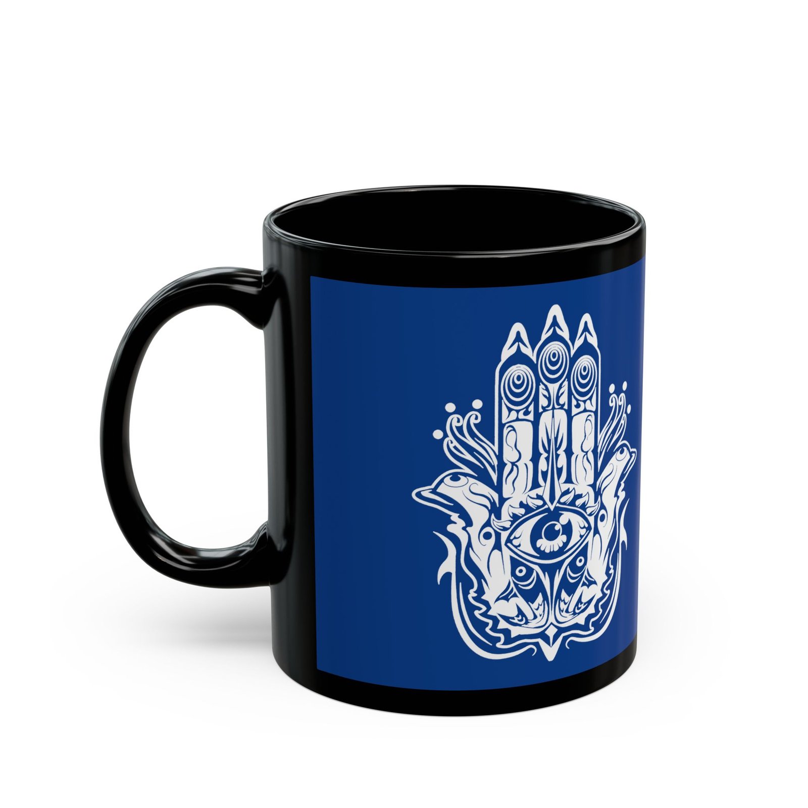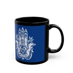 Bring balance to your daily routine with this elegant Hamsa black ceramic mug. Featuring a beautifully detailed hand of Fatima design, this 11 or 15 oz mug is more than just drinkware.