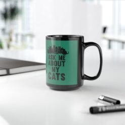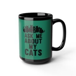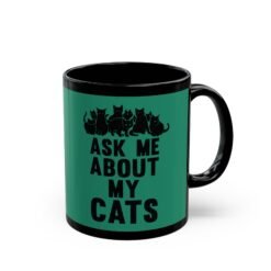 Start your morning with caffeine and cat pride using this sleek black Ask Me About My Cats mug. Featuring an adorable crowd of curious kitties and bold lettering, this 11 or 15 oz ceramic mug is perfect for every cat lover who’s ready to talk whiskers before they’ve even finished their coffee.