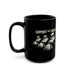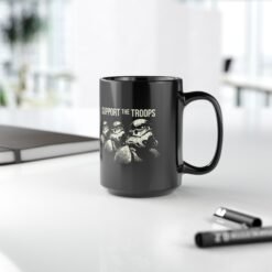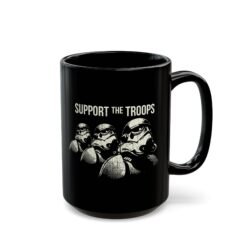 Show your galactic pride with a side of humor in this bold Support the Troops black ceramic mug! Featuring three stormtroopers standing in line and the iconic phrase above, this 11 or 15 oz mug is the perfect blend of sci-fi sass and everyday caffeine. Whether you’re headed to the office or hyperspace, this mug has your six.