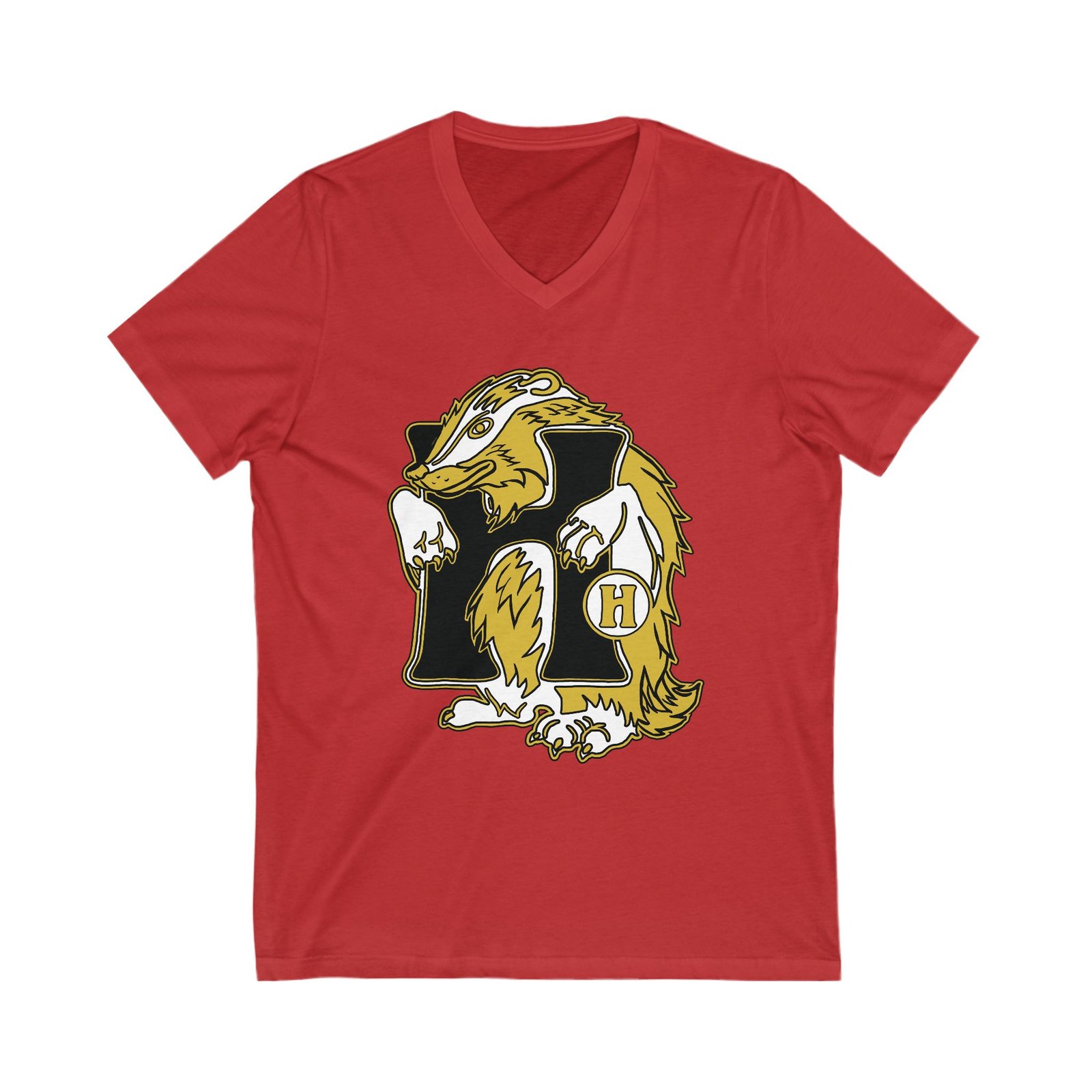 House of Badger V-Neck, Unisex Fantasy Shirt, Cotton Wizard Tee, Magical House Apparel, Loyal Fan T-Shirt, Badger Emblem Clothing, Subtle Magic Tee, V-Neck Fantasy Fashion