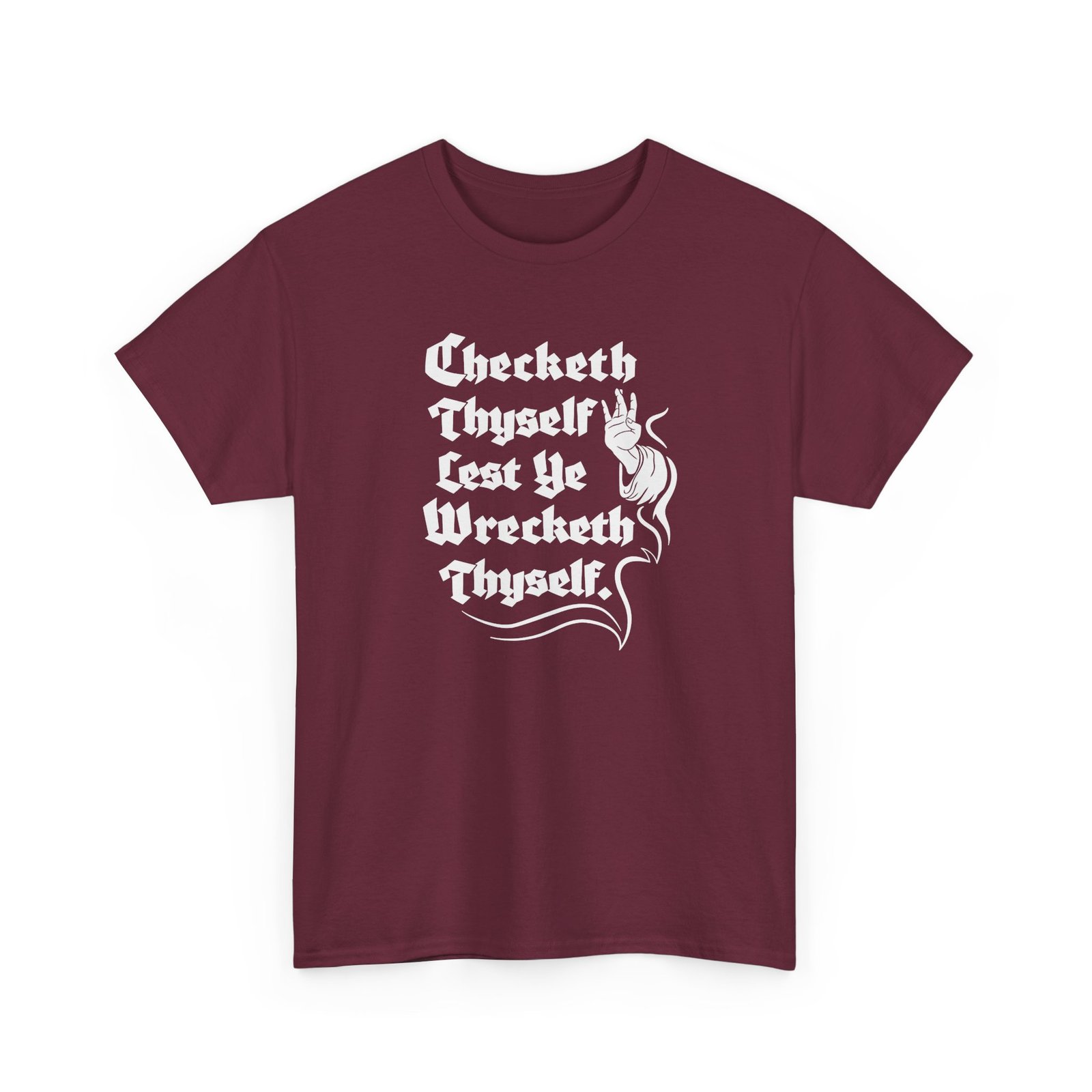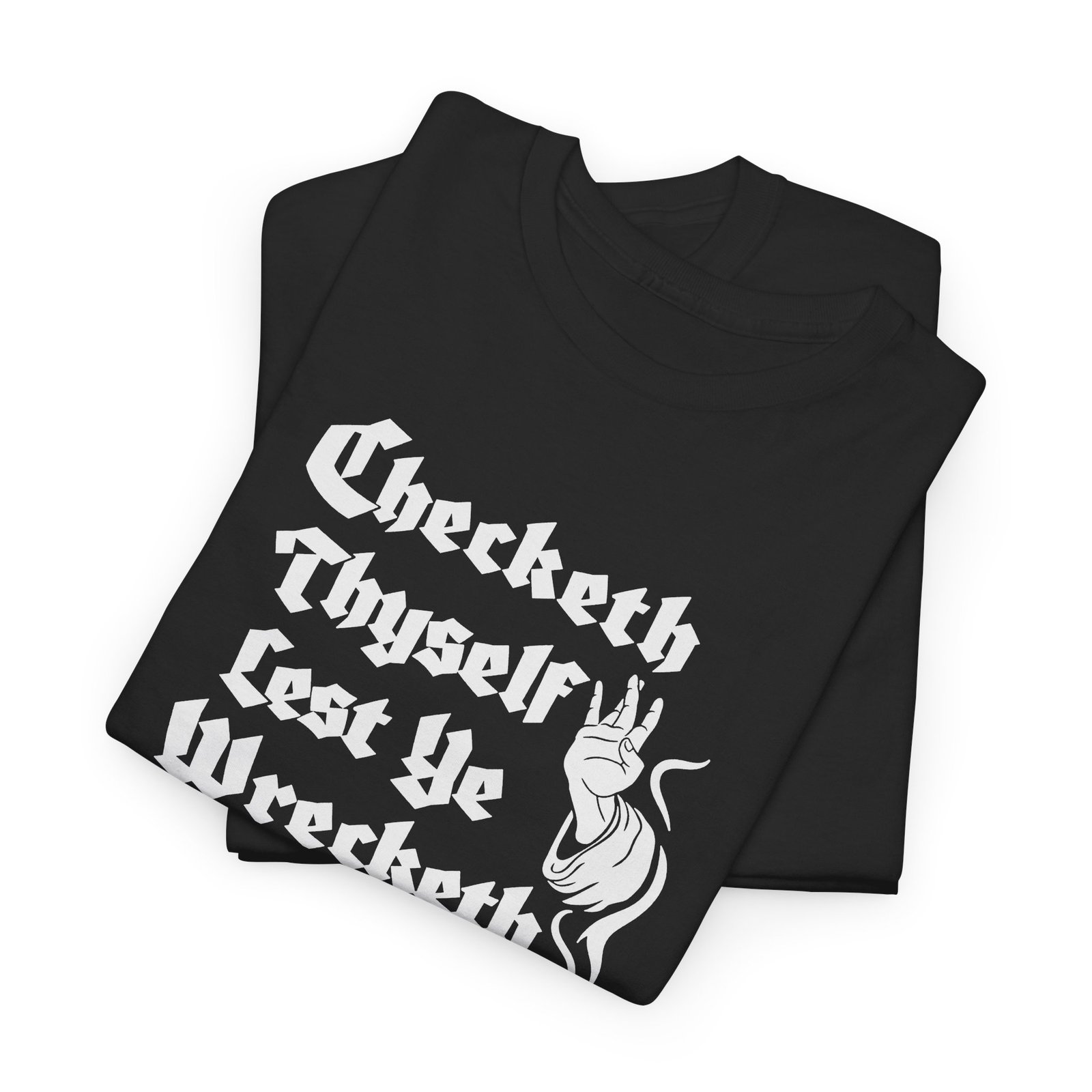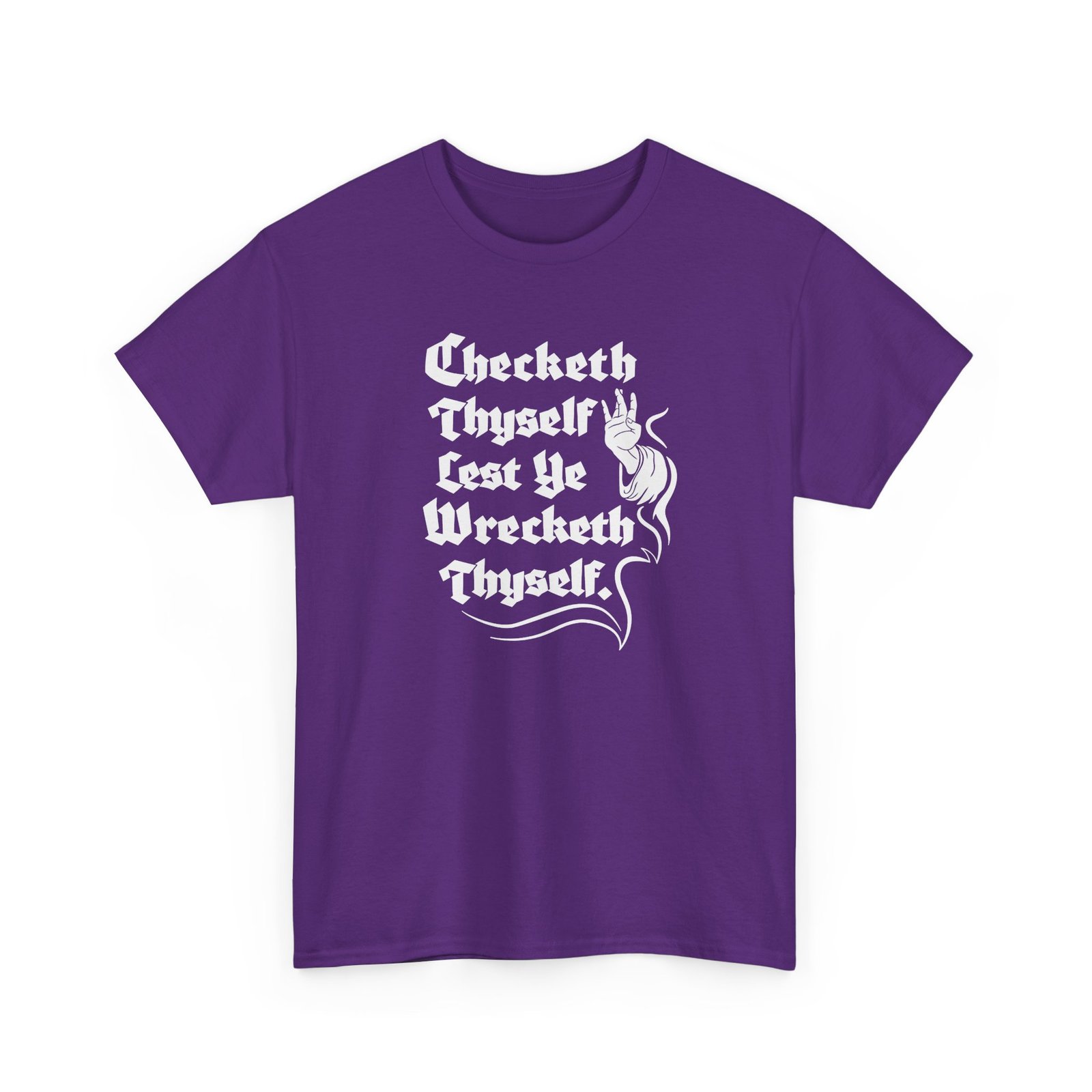 Tags: Check Thyself Shirt, Funny Medieval T-Shirt, Old English Humor Tee, Unisex Renaissance Shirt, Shakespeare Style Quote Tee, Wreck Yourself Joke Shirt, Clever Wordplay Clothing, Historical Humor Graphic Tee, Medieval Sayings Shirt, Nerdy Humor Apparel