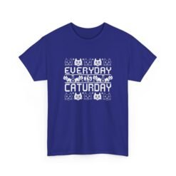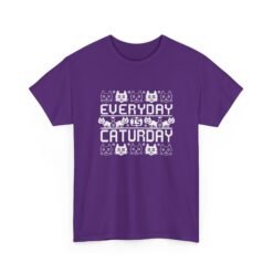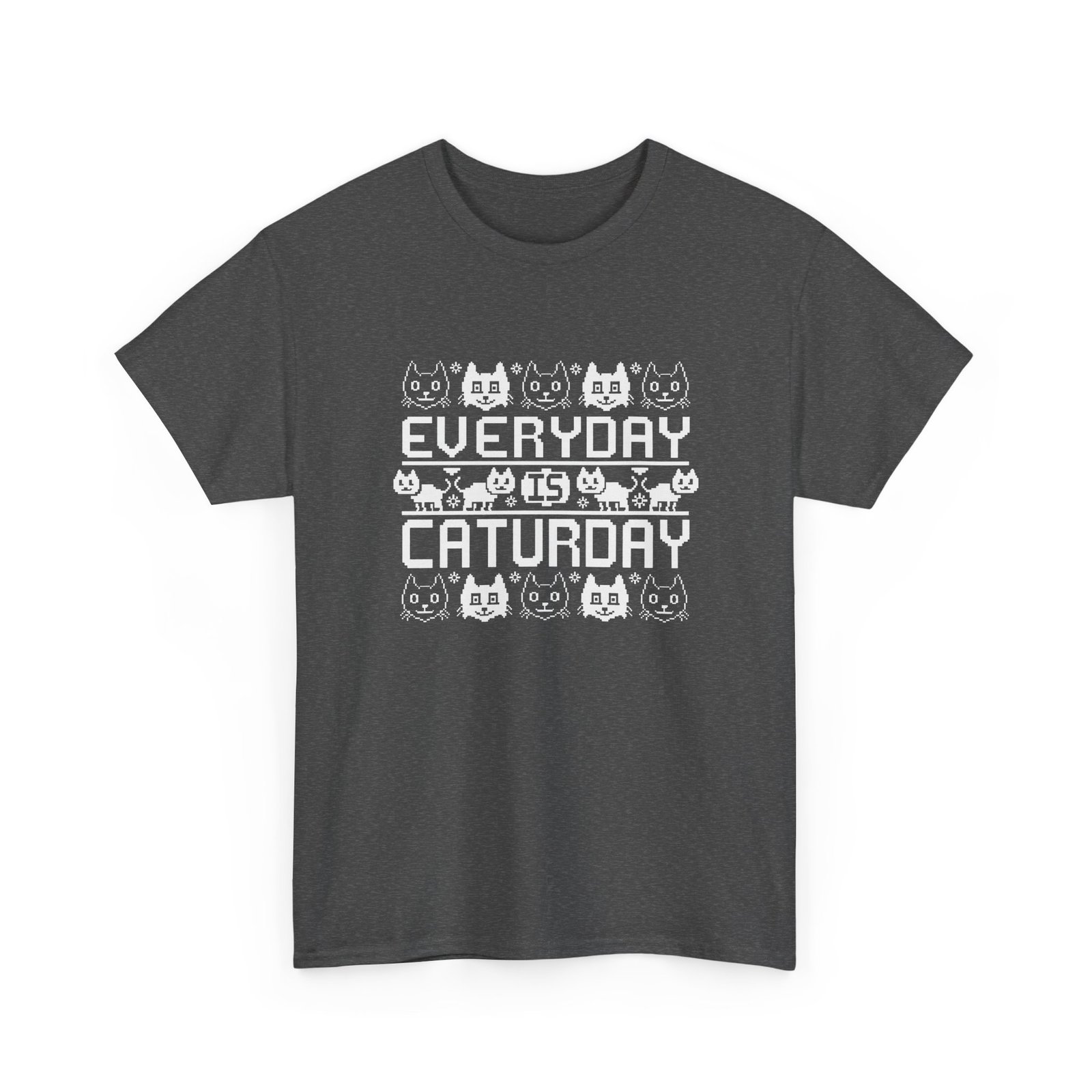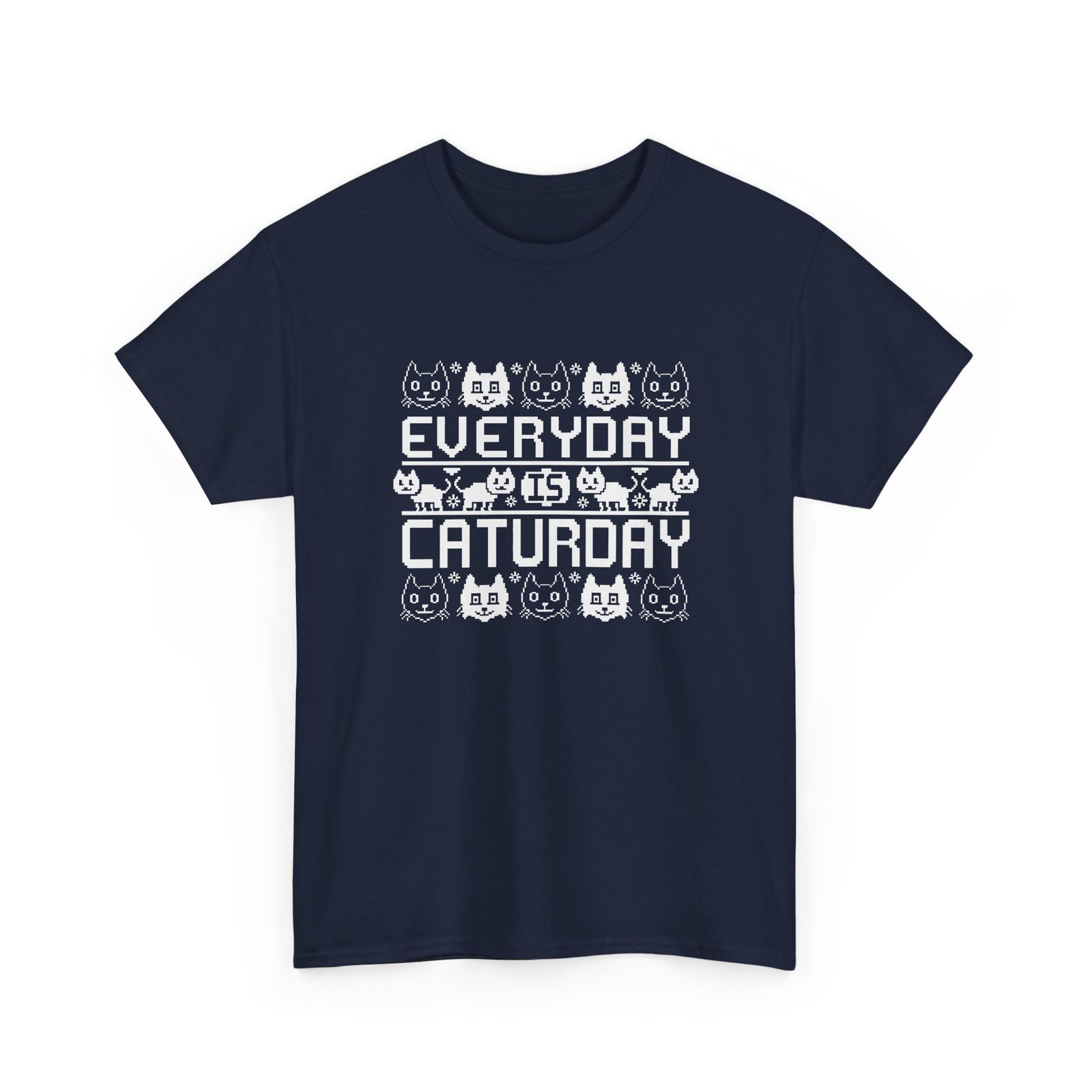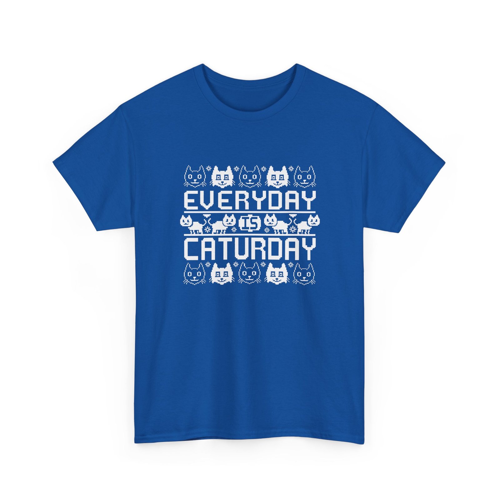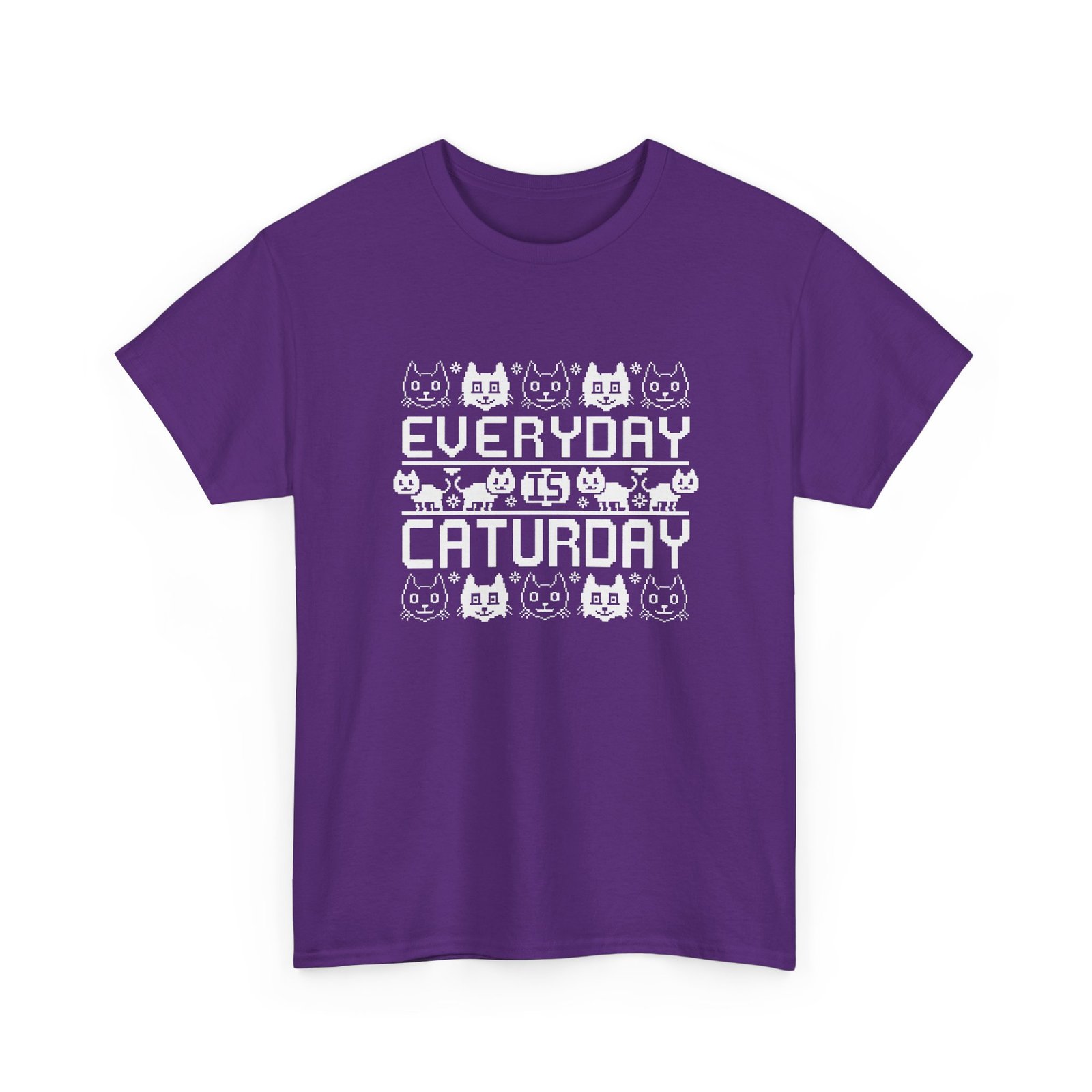 Celebrate nonstop kitty bliss with this unisex tee featuring the phrase Everyday Is Caturday in a cozy, ugly-sweater–style print.