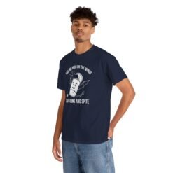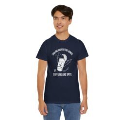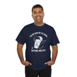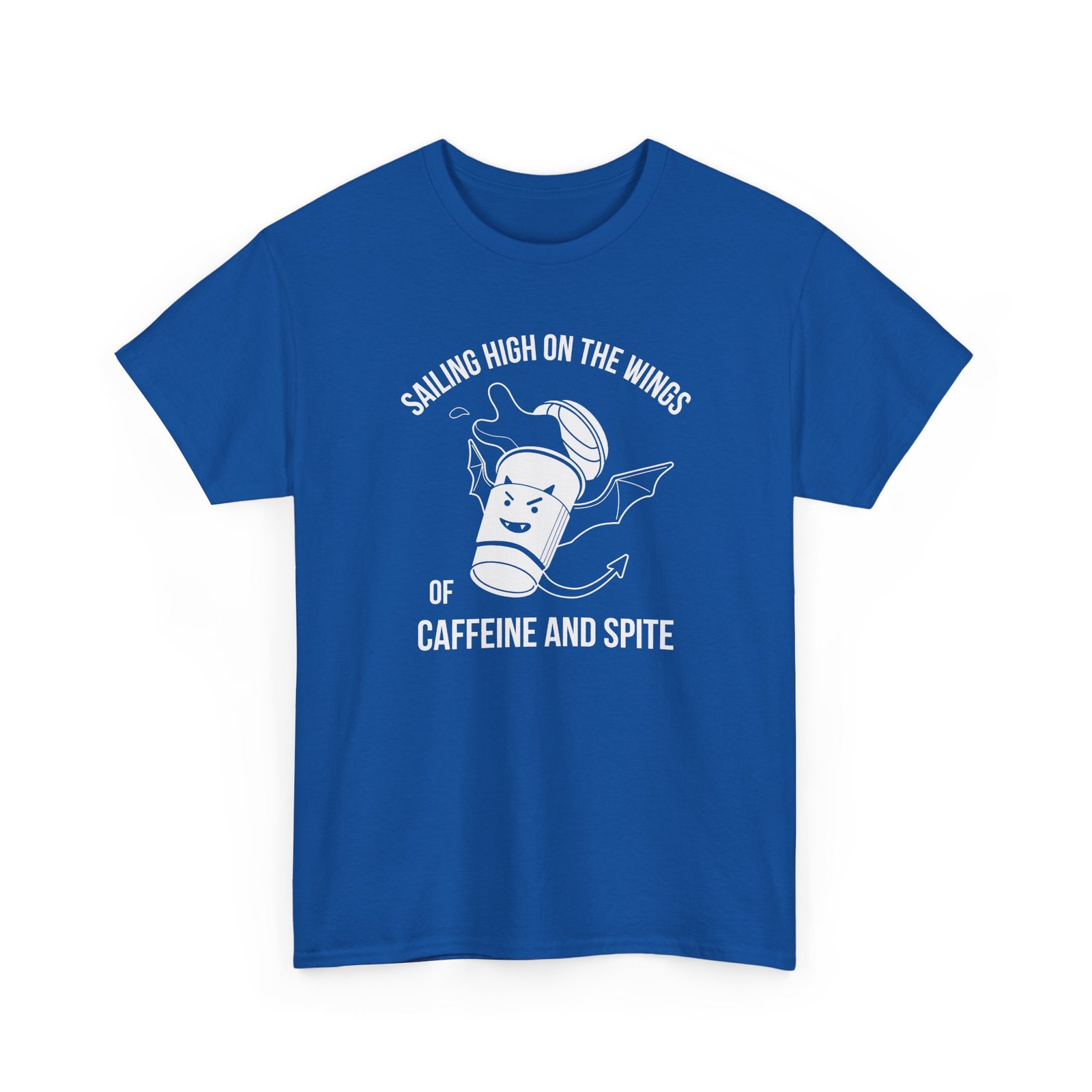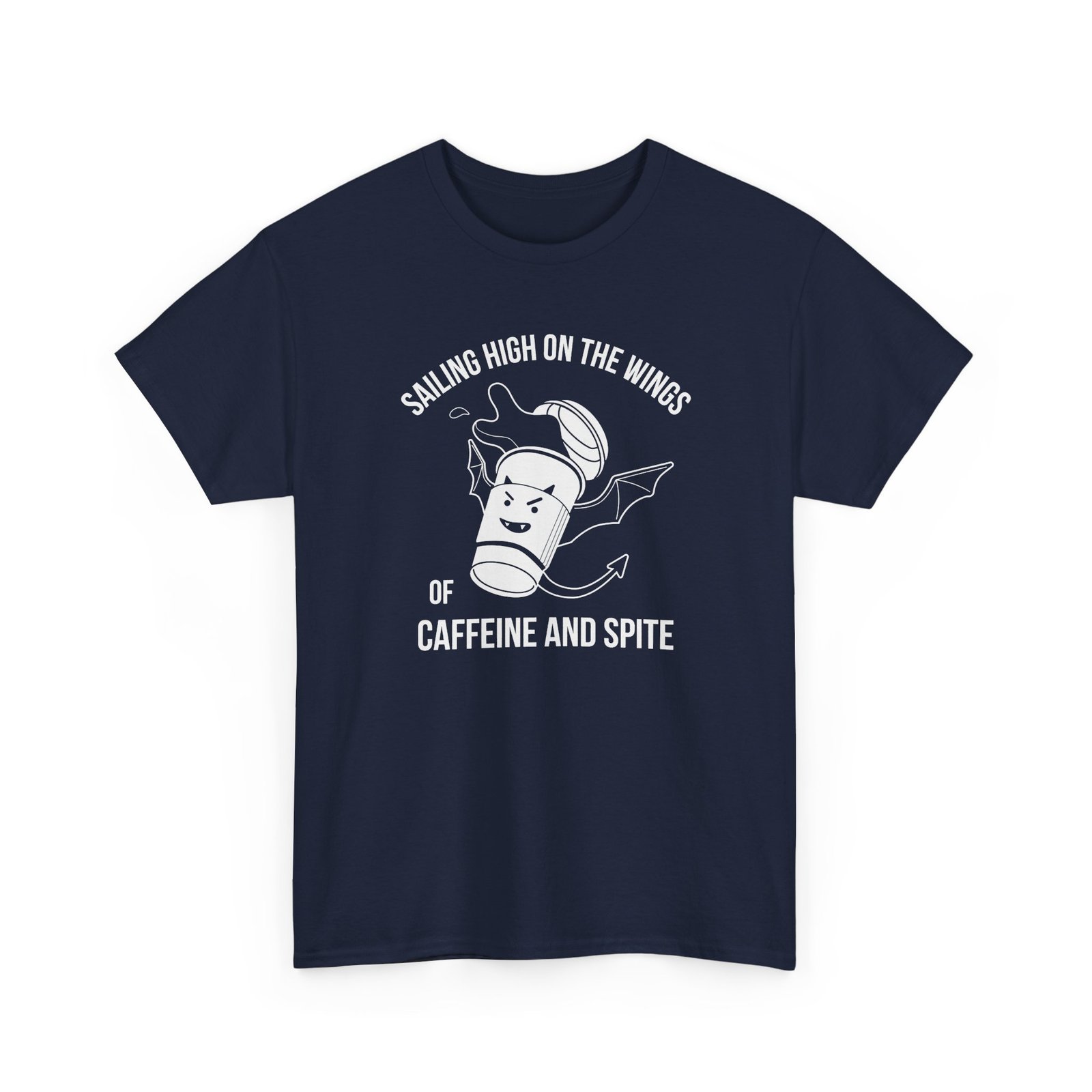 Unleash your inner creature of the night with this unisex tee featuring a flying coffee cup complete with fangs, bat wings, and a devil’s tail. Paired with the words Sailing High on the Wings of Caffeine and Spite, this design is perfect for anyone who runs on espresso and attitude.