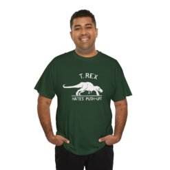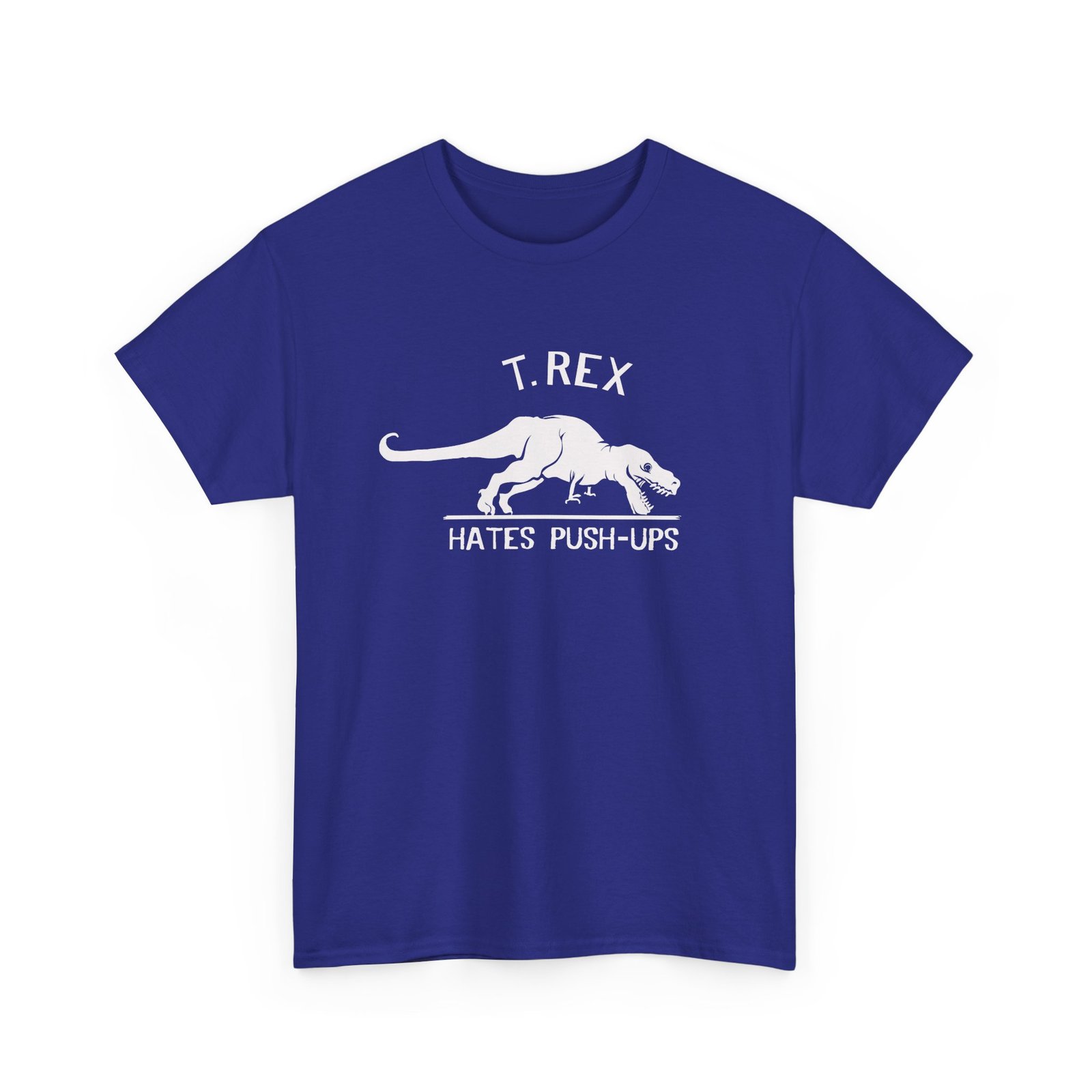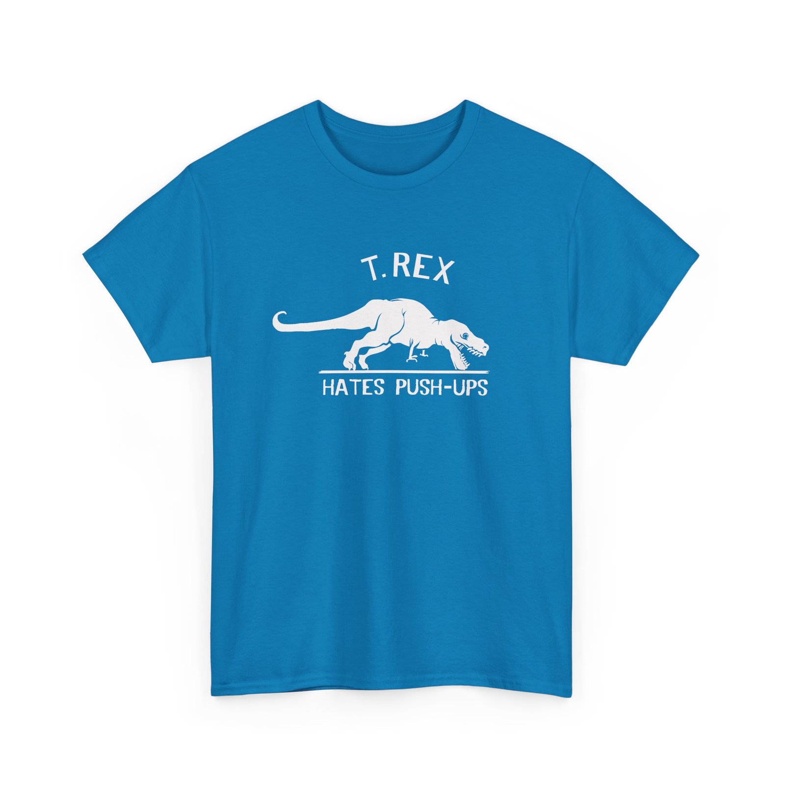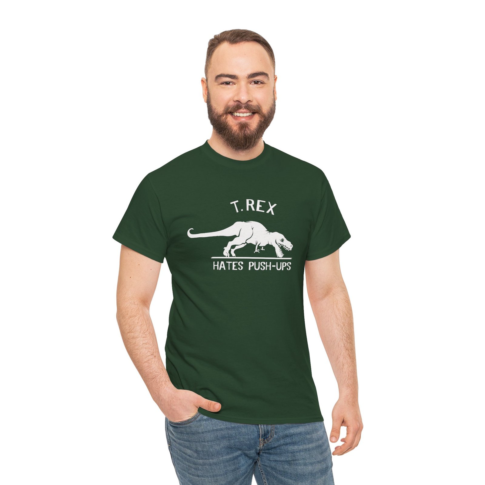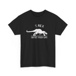 Bring on the laughs with this unisex tee featuring a T. Rex struggling through push-ups and the phrase T. Rex Hates Pushups. Perfect for dino lovers, gym jokesters, and anyone who appreciates a little prehistoric humor.