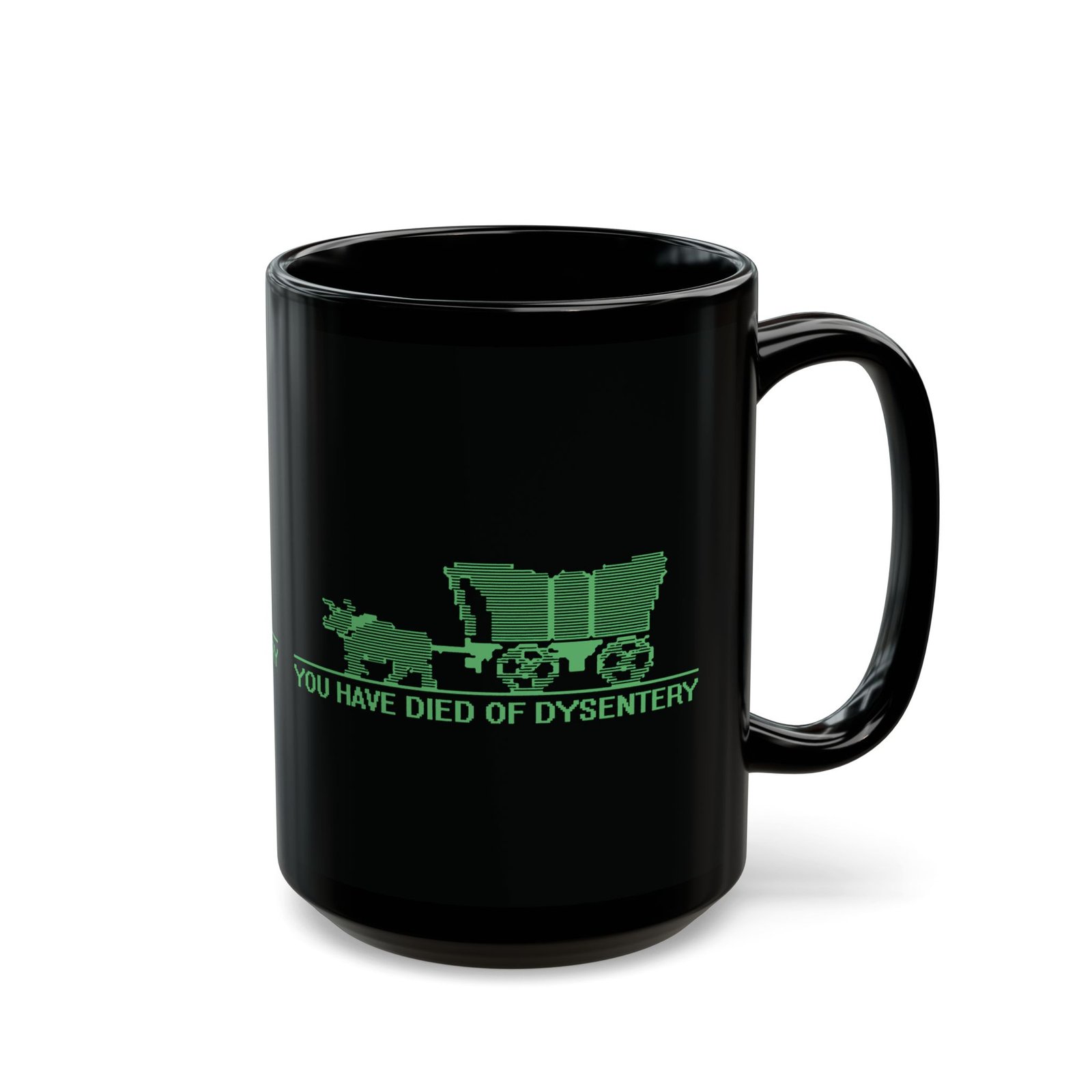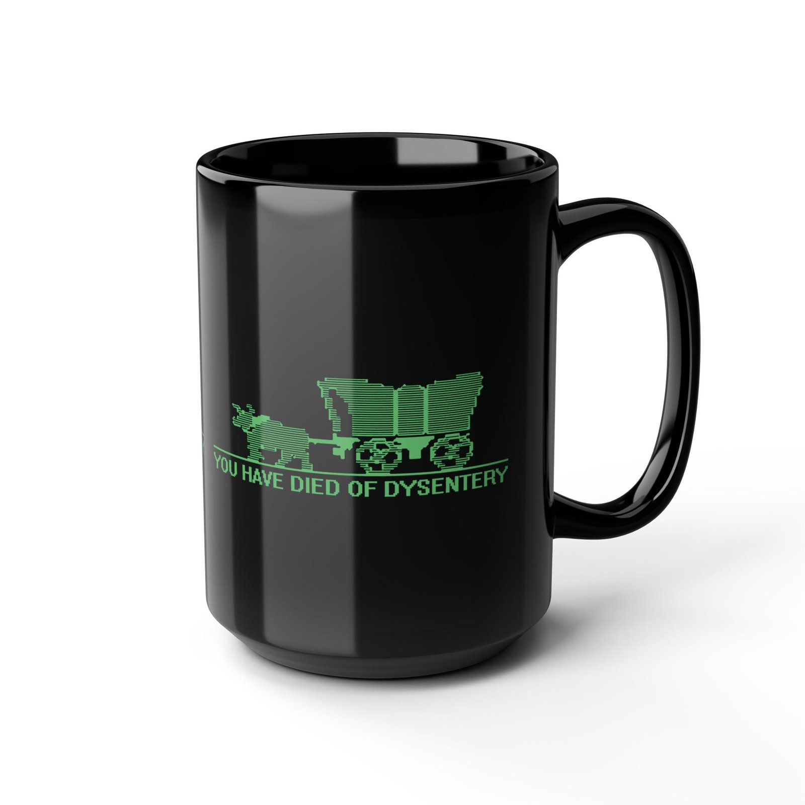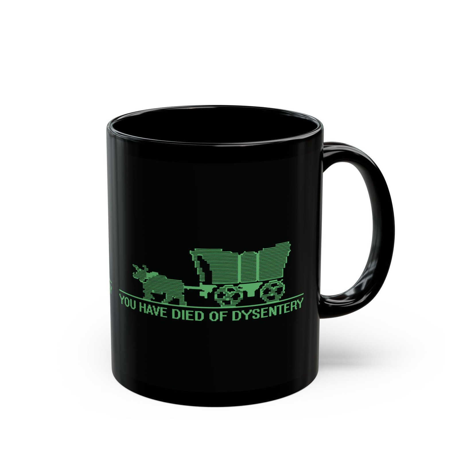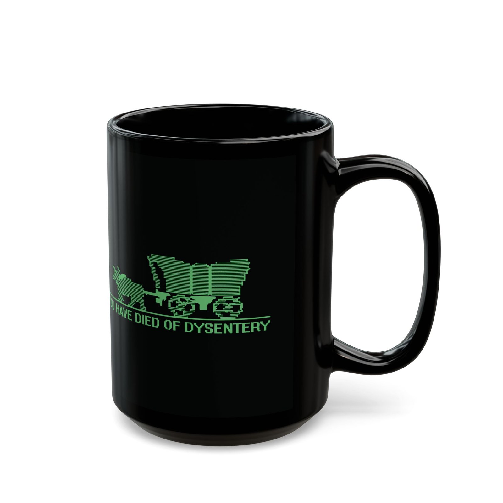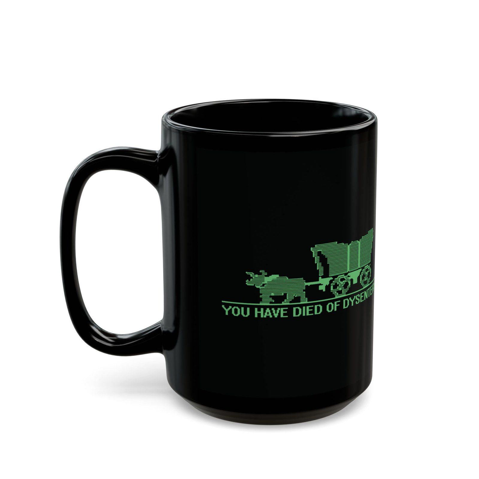 Sip your drink and relive one of gaming’s most iconic defeat screens with this black ceramic mug featuring the classic Oregon Trail wagon graphic and the unforgettable phrase You Have Died of Dysentery. Perfect for retro gamers, nostalgia buffs, and anyone who enjoys a dash of dark humor with their morning coffee.